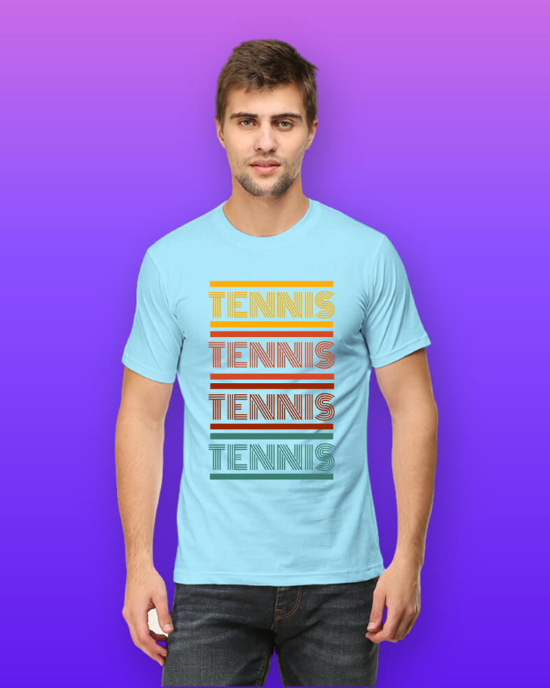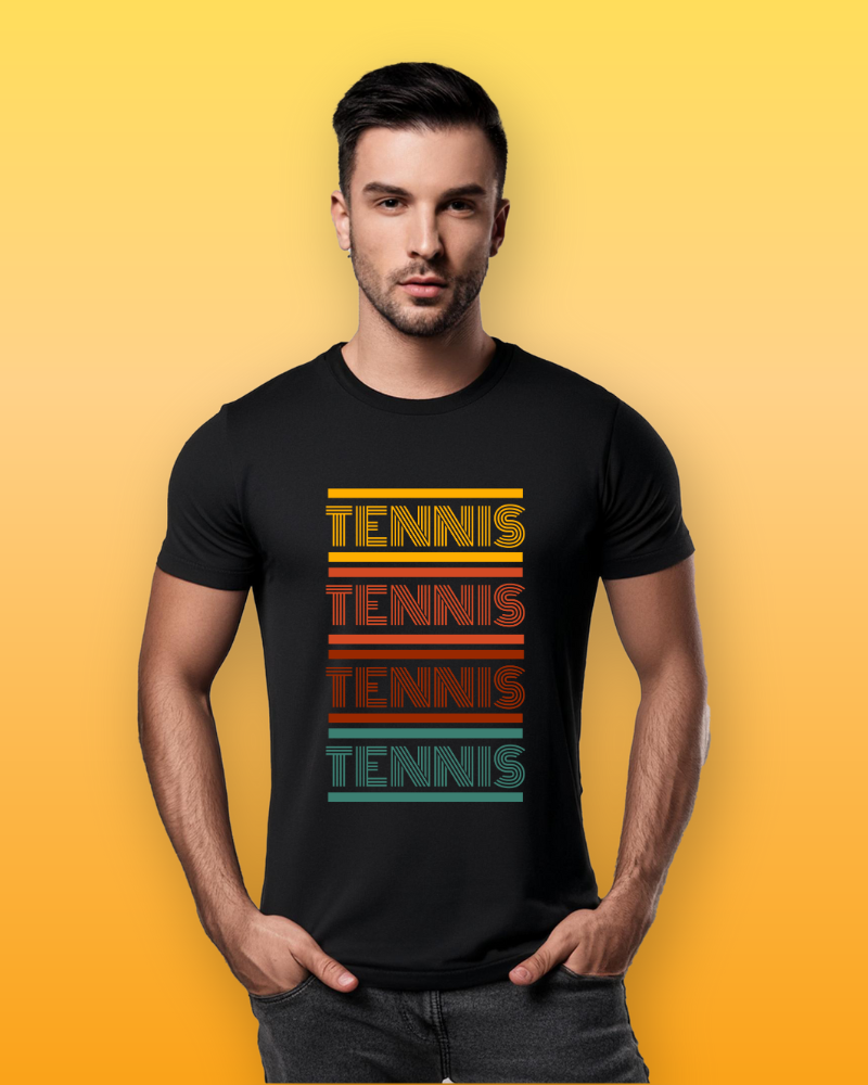 The t-shirt showcases a stacked “TENNIS” print in vibrant hues of yellow, orange, and teal, set against a black background for maximum contrast. The retro-inspired font and repetitive design make a bold statement, celebrating the sport in a fun and stylish way.