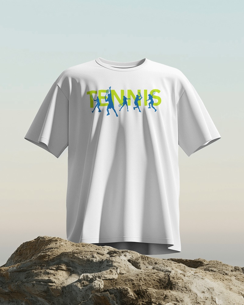 The t-shirt displays dynamic blue silhouettes of tennis players in different action poses, such as serving, volleying, and smashing, set against a bold, lime-green “TENNIS” background. This design captures the essence of the sport and is sure to make a statement both on and off the court.