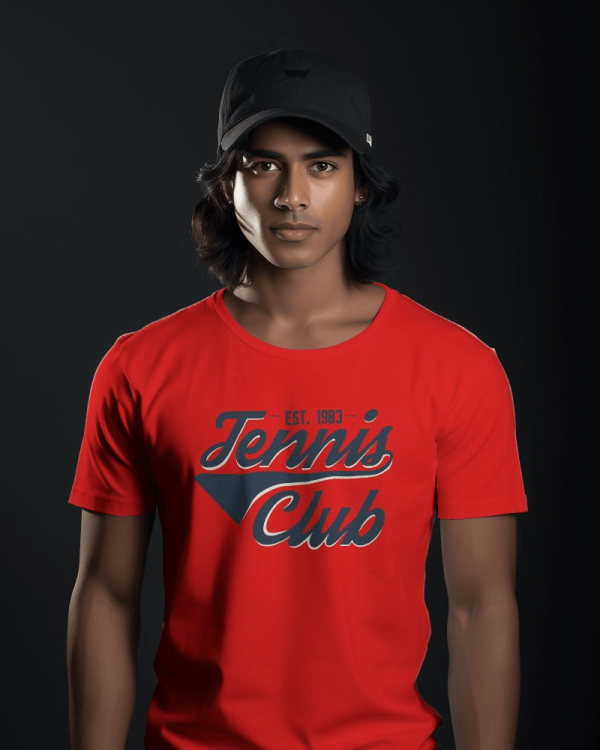 The t-shirt features a vintage-inspired “Tennis Club” script in bold, navy blue lettering with a shadow effect. The design exudes a classic and timeless vibe, perfect for tennis enthusiasts who value tradition and style.